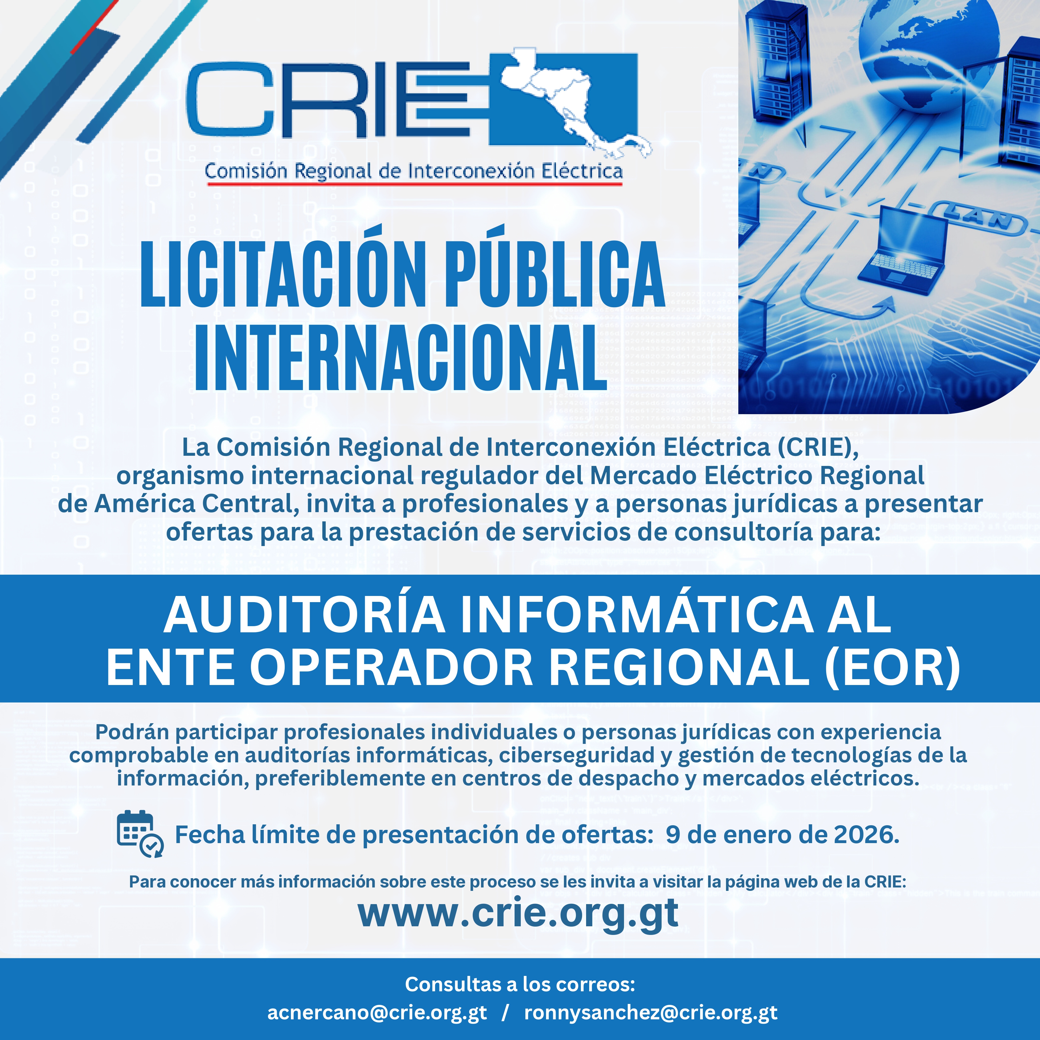 La Comisión Regional de Interconexión Eléctrica (CRIE), invita a profesionales y a personas jurídicas a presentar ofertas para la prestación de servicios de consultoría para "Auditoría Informática al Ente Operador Regional (EOR)".